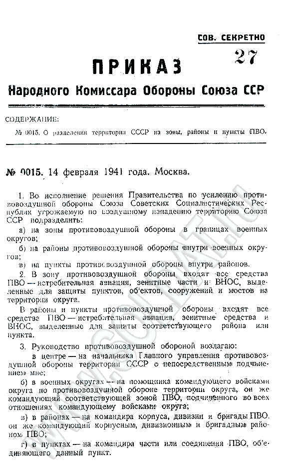 О разделении территории СССР на зоны, районы и пункты ПВО |