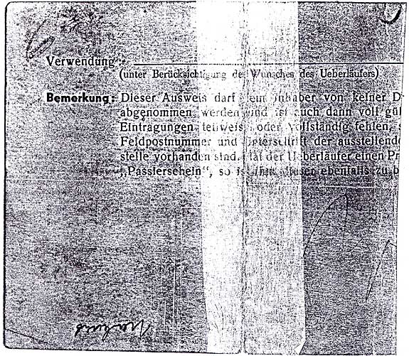 Пропуск на Павлова Александра - сторона 2.Текст на документе: Bemerkung: Dieser Ausweis darf tem inhaber von keiner Diens… abgenommer werden ind ist auch dann voll gultig wen Eintragungen teilweis oder vollstandigfehlen, sofern n… Feldpostnummer und Unterschrift der ausstellenden. Du… stele vorhanden sind. Hat der Ueberlaufer einen Propa… "Passiershein", so is ihm dieser ebenfalls zu belas … Далее