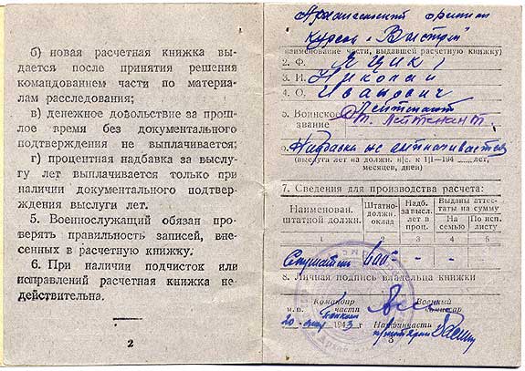 Расчетная книжка начальствующего состава Красной Армии (обр. 1943 г.) - разворот 3