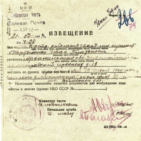 Извещение полевой почты 15332 - сторона 1
