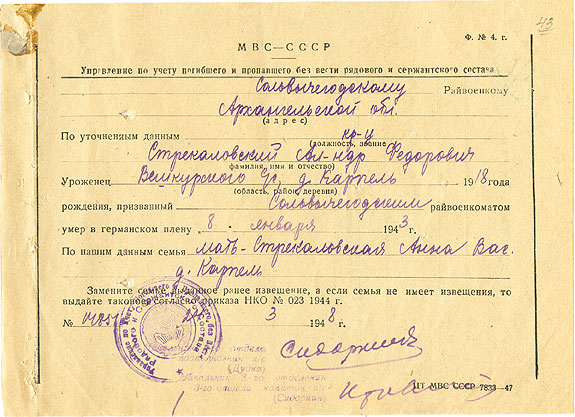 Извещение Управления по учету погибшего и пропавшего без вести рядового и сержантского состава на умершего в германском плену Стрекаловского Александра Федоровича (стандартное)