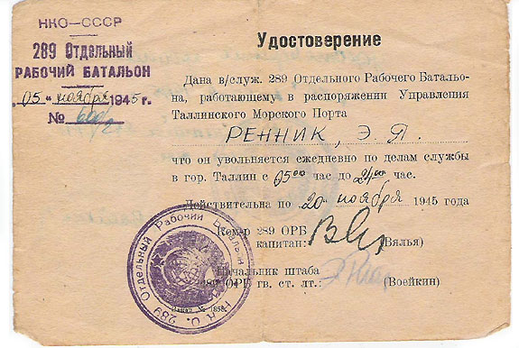 Увольнительное удостоверение 289 отдельного рабочего батальона"