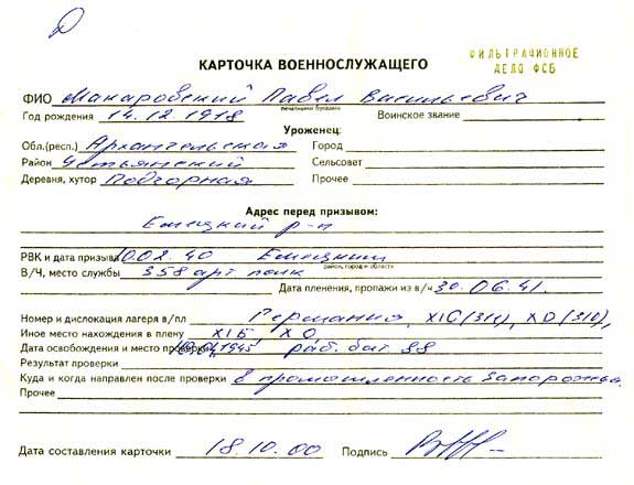 Выборка сведений из фильтрационного дела ФСБ бывшего военнопленного Макаровского П.В.