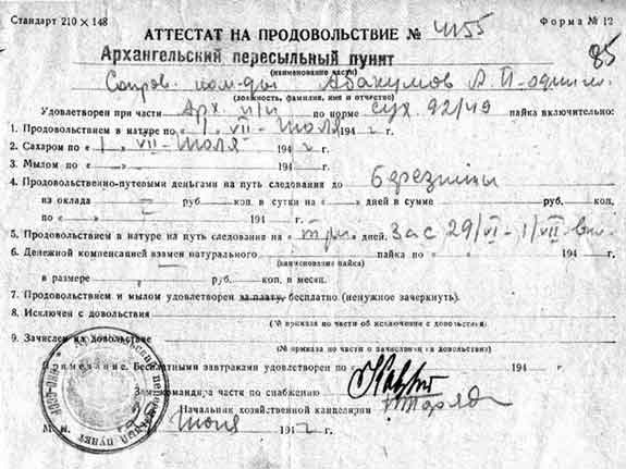 Продовольственный аттестат для командированного военнослужащего образца 1942 г.