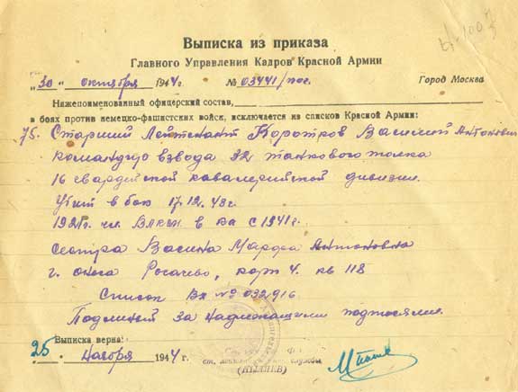 Выписка из приказа Главного Управления Кадров Красной Армии