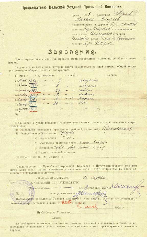 Заявление о предоставлении льготы по призыву в армию 1927 г.