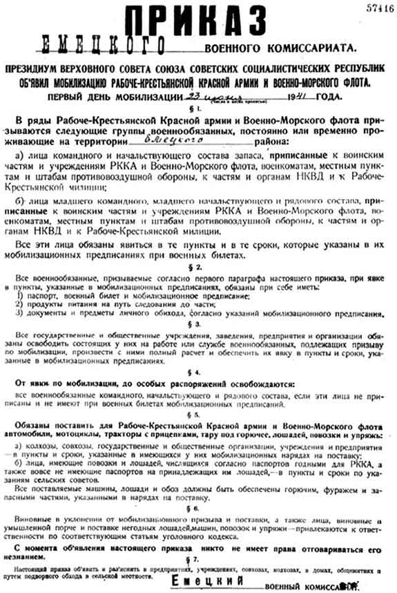 Приказ об объявлении мобилизации 23 июня 1941 г.