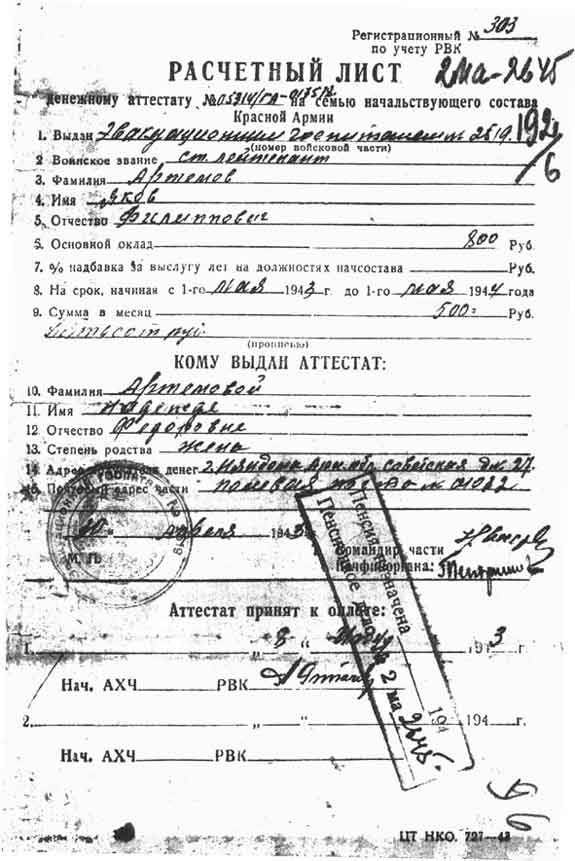 Расчетный лист к денежному аттестату офицера образца 1942 г.