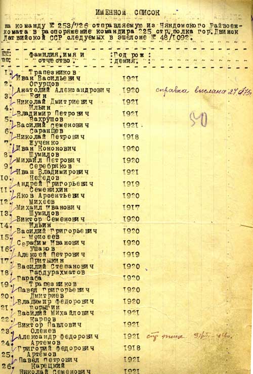 Список на команду 253/726, отправленную Няндомским РВК в 225 сп, г.Двинск