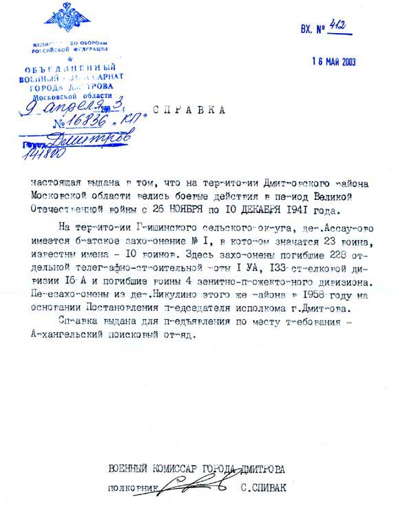 Справка ОГВК г.Дмитрова от 09.04.2003