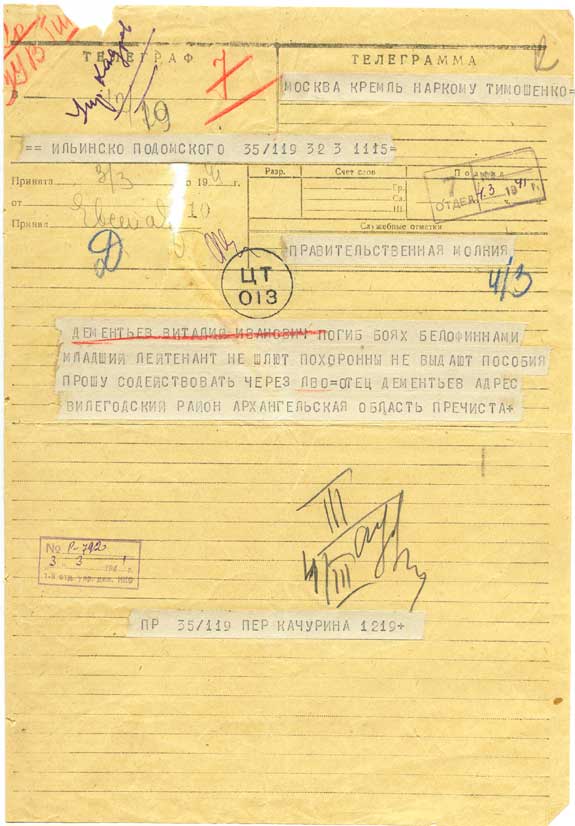 Телеграмма о гибели Дементьева Виталия Ивановича
