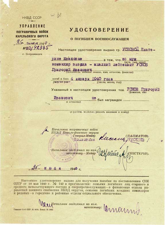 Удостоверение о погибшем военнослужащем (5 видов; Финская война) - страница 1