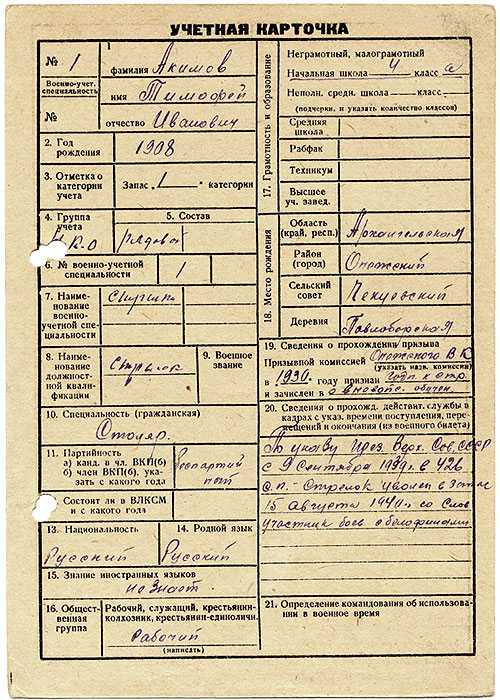 Учетная карточка военнообязанного, составленная до 22.06.41 - сторона 1