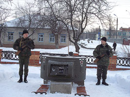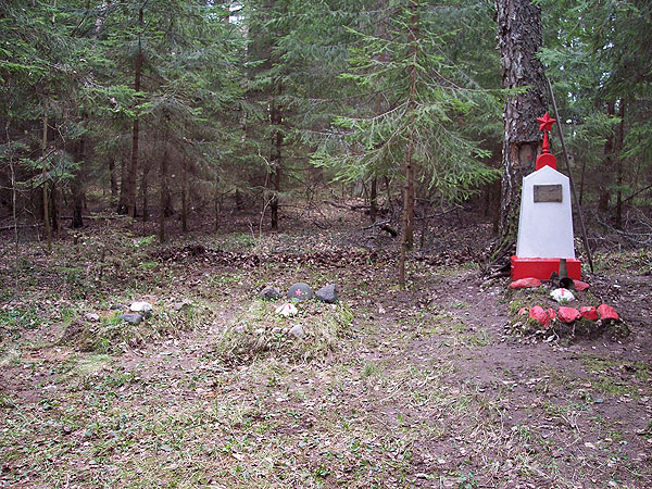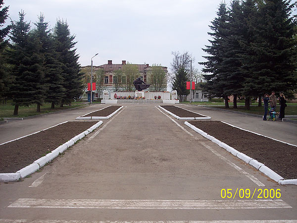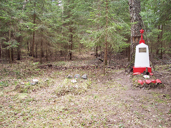 Я набросал фотографий памятника с различной экспозицией. Если нужно, выбирайте любой. Перед памятником могила с останками Шкребтия и Малахова. Слева от него могила с останками нескольких красноармейцев, которых расстреляли гитлеровцы в 1941 году (мы подняли их в 2001 году). Никто не установлен. Самая левая могила с останками еще одного безымянного красноармейца (поднят в 2005 году).