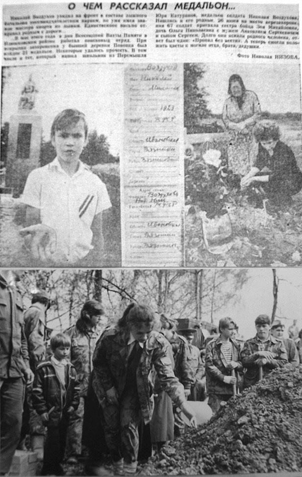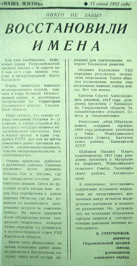 Апрель-май. Международная Вахта Памяти в Смоленской области. У д. Старое Устиново Ельнинского района подняли из воронки в лесу 16 человек. Нашли несколько медальонов. Прочлись три. Это заметка из нашей районной газеты "Наша жизнь" с прочитанными медальонами.