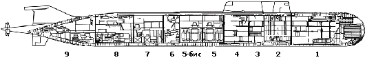 Первый отсек (7 человек) Второй отсек (36 человек) Третий отсек (24 человека) Четвертый отсек (12 человек) Пятый отсек (11 человек) Пятый-бис отсек (4 человека) Шестой отсек (5 человек) Седьмой отсек (9 человек) Восьмой отсек (7 человек) Девятый отсек (3 человека)