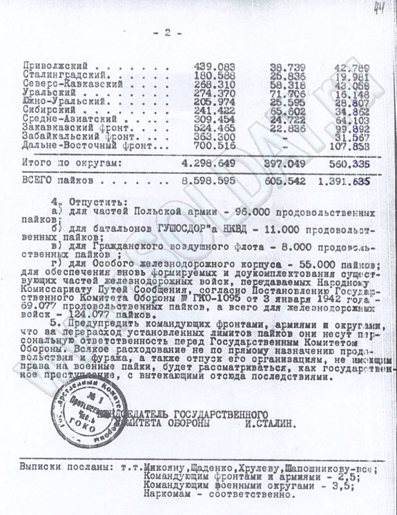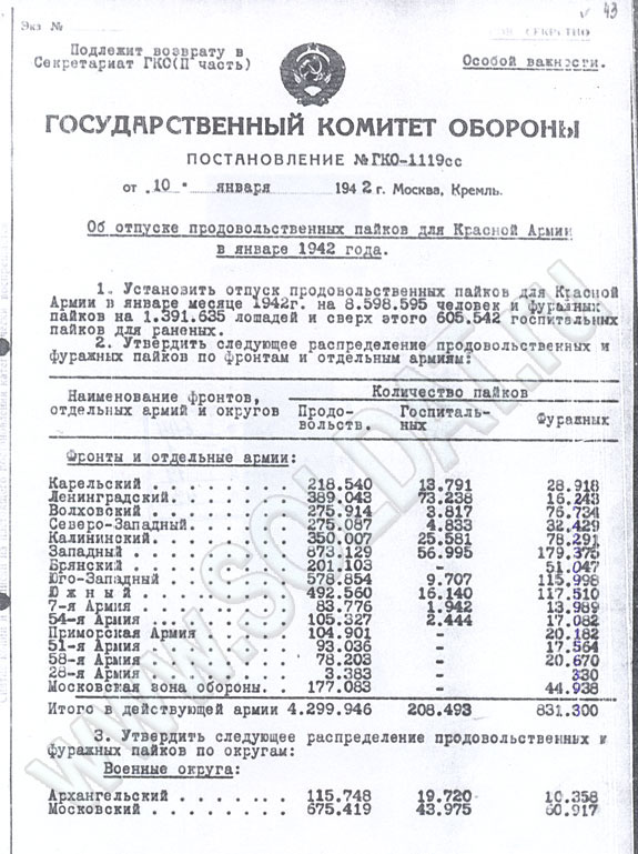 Несколько цифровых примеров. На начало войны численность ВС составляла около 5.100.000 человек, за 1941 год было призвано 14 млн человек. Представим, если бы никто не погиб, то к концу 1941 года в армии числилось бы 19,1 млн человек. А на 1 января 1942 года количество пайков в РККА, РКВМФ, войсках НКВД и военизированных формированиях НКПС было установлено лишь около 9,5 млн штук (сведения из Постановления ГКО № 1119 от 10.01.1942, сканы 1, 2).