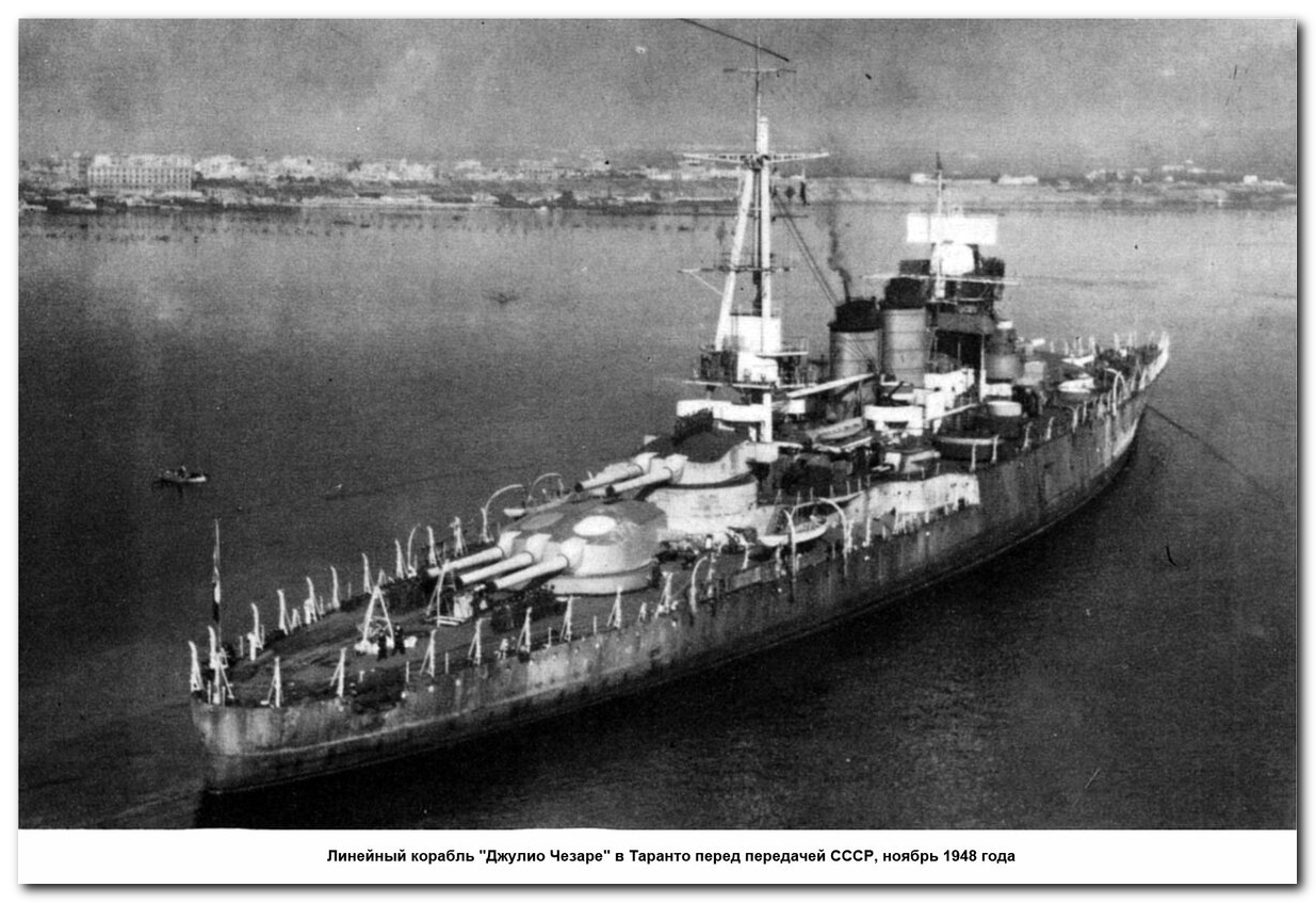 Гордость Италии – линкор "Джулио Чезаре", наречённый звучным именем римского военного трибуна и императора Юлия Цезаря на борту, был навязан Советскому Союзу в феврале 1949 года союзниками в результате репарационной сделки. Мы претендовали на более современный линкор "Витторио Венето". А этот старый рыдван, слепой и глухой по оптике, акустике и локации, был просто опасен в дальнейшей эксплуатации. Приняли как дареного коня по суровой необходимости.