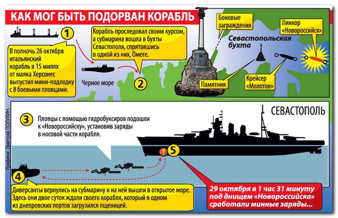 - атака модернизированного линкора "Новороссийск" совершена его подельниками при его личном участии.