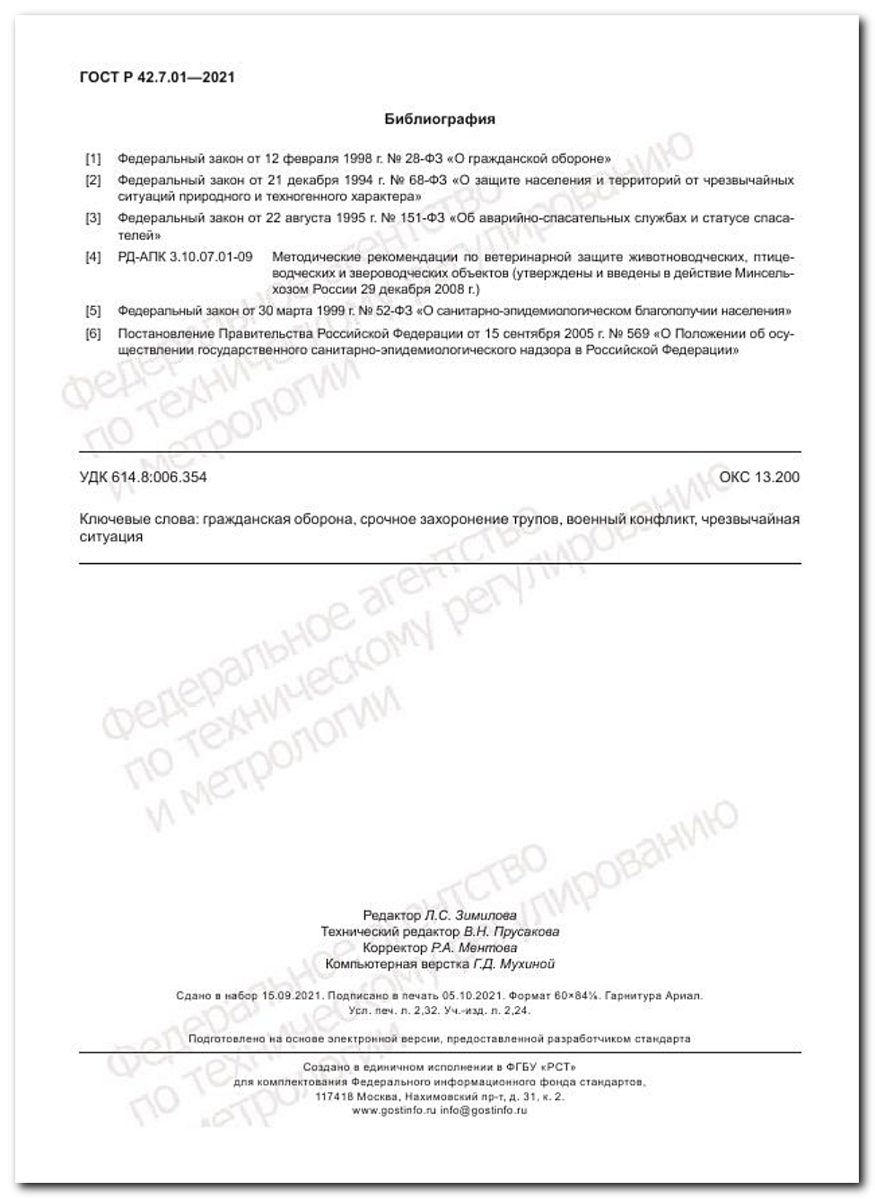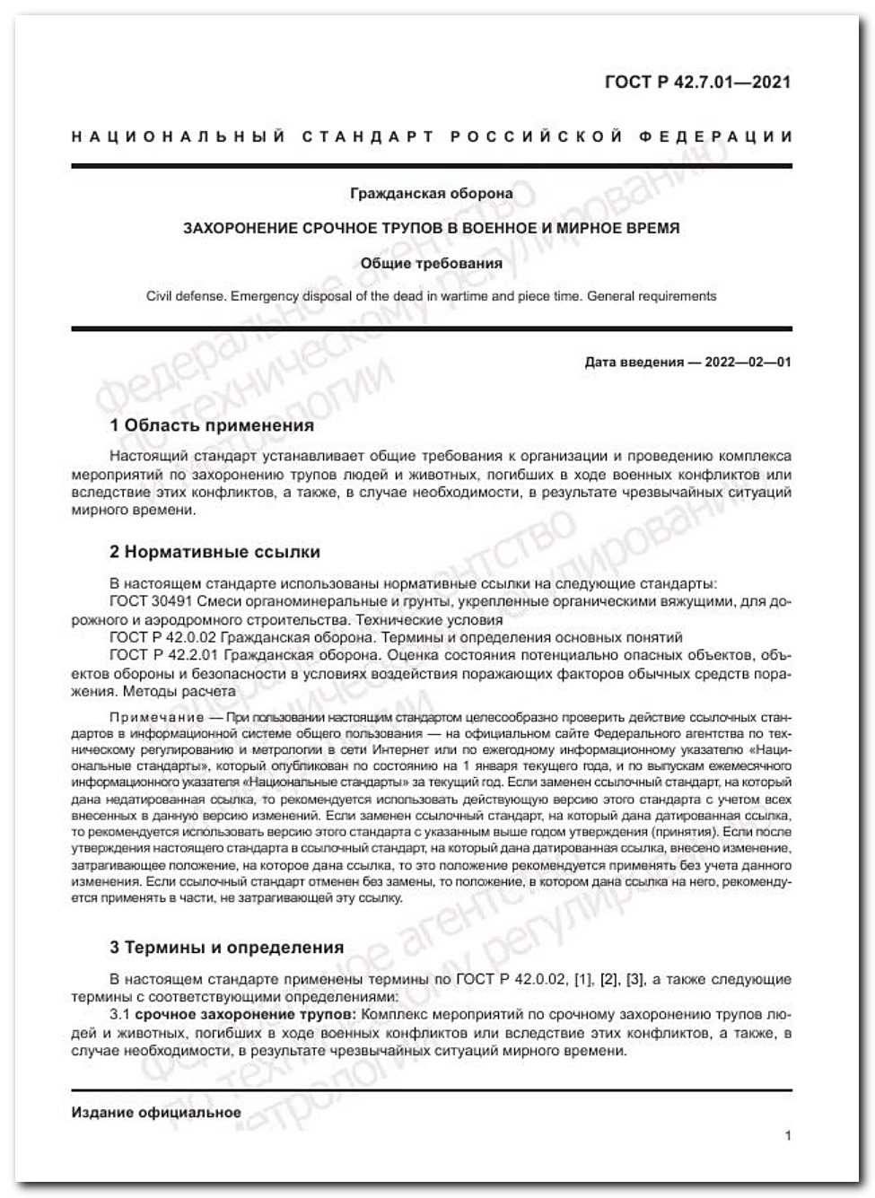 Публикуемый документ получен с сайта Росстандарта. Утверждён 13.09.2021, будет введён в действие 01.02.2022. Как подчёркнуто в документе на странице 2 - введён ВПЕРВЫЕ. Напомню, что Приказ НКО СССР № 138 "С объявлением Положения о персональном учете потерь и погребении личного состава Красной Армии в военное время" был подписан 15 марта 1941 г. См. сканы тут https://www.soldat.ru/doc/nko/1941.html Т.е. введён в действие загодя до известных событий. Сейчас Правительство России ведёт тихую планомерную подготовку сил и средств к предстоящим Событиям. Введённый в действие стандарт позволяет спланировать действия государственных и нештатных формирований Гражданской Обороны при возникновении военных конфликтов, а также чрезвычайных ситуаций в мирное время.