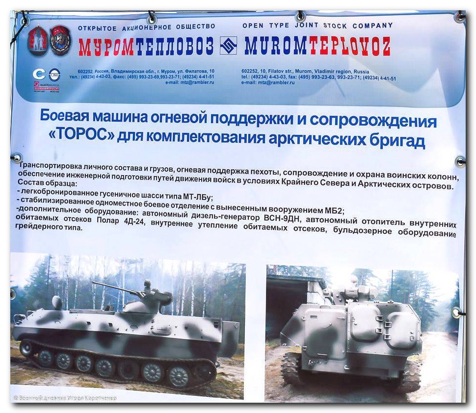Для подразделений, действующих в условиях Арктики, разработана и боевая машина огневой поддержки "Торос". Активизация работы отечественных инженеров и конструкторов по созданию спецтехники для арктических частей, вывела её на принципиально новый функциональный уровень. От обычного многоцелевого бронированного транспортёра – тягача МТ-ЛБ "Маргаритка" тот же "Торос" отличается рядом преимуществ. Установка одноместного боевого модуля, в котором смонтировано стабилизированное 30-мм автоматическое орудие 2А42 с дальностью поражения 4 км и боекомплектом три сотни снарядов, делает "Торос" грозной машиной. Её огневая мощь усилена 7,62-мм пулемётом ПКТМ с двумя тысячами патронов и установкой 30-мм автоматического гранатомёта АГ-17, рассчитанного для работы на дистанциях до 1700 метров (запас гранат – до 300 штук).