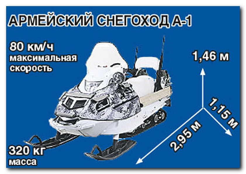Базой для создания армейского снегохода А-1, проявившего себя в условиях вечной мерзлоты как надёжная машина, послужила уже хорошо зарекомендовавшая себя модель "Тайга Патруль 551 СВТ" с двухтактным двухцилиндровым двигателем РМЗ-551. Его мощность составляет 65 лошадиных сил. Армейское наполнение включает в себя крепление для установки двух пар лыж, гранатомёта, автомата АК-74 и винтовки СВД. Бензобак снегохода А-1 имеет самозатягивающееся покрытие.