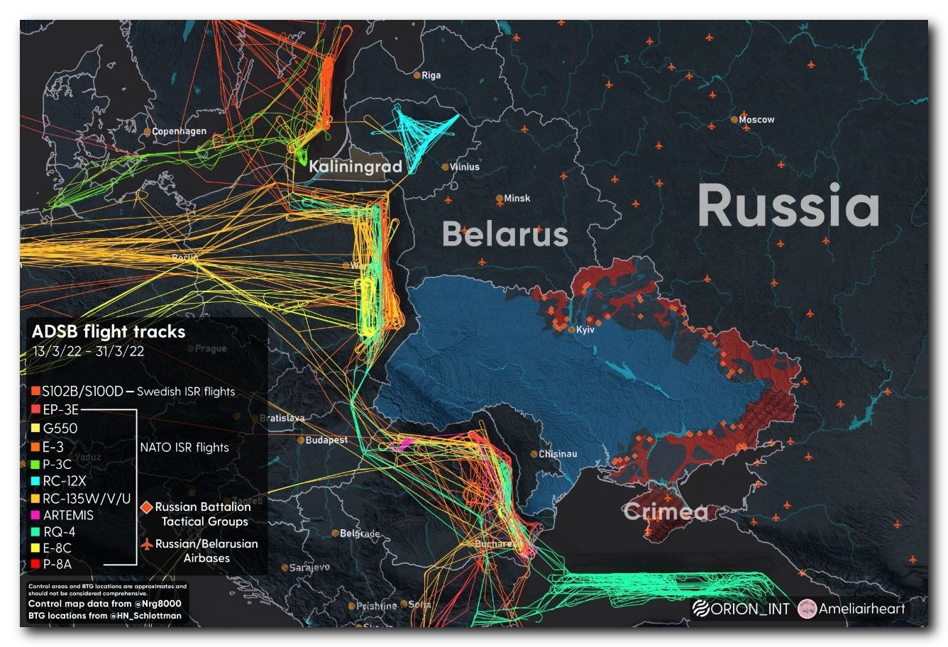 Интенсивность деятельности разведывательной авиации НАТО и Швеции вдоль границ Белоруссии, Украины, Крыма в период с 13 по 31 марта на фоне проведения военной специальной операции ВС РФ.