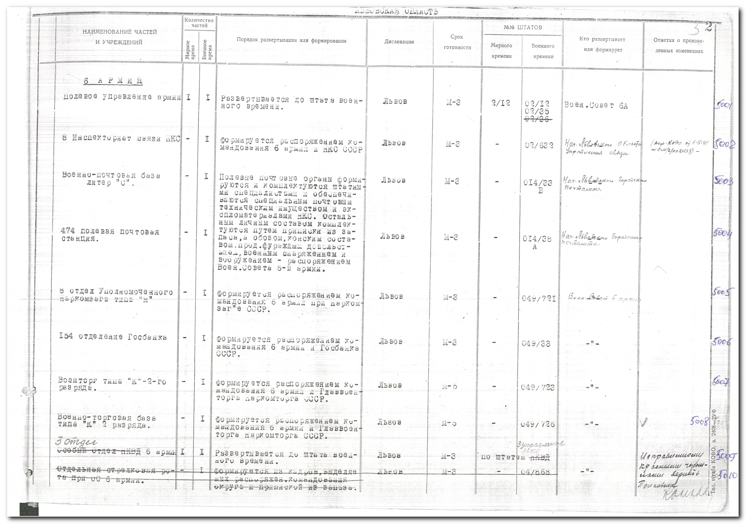 Ниже представлены копии двух листов схемы развёртывания частей Киевского Особого военного округа в Львовской области в 1941 г. С правой стороны второго листа от руки автором подписаны номера команд, которые были пропечатаны в оригинале очень тускло и на ксерокопии почти не видны. Документ официально рассекречен и скопирован автором с уплатой собственных средств в установленном порядке в ЦАМО РФ.