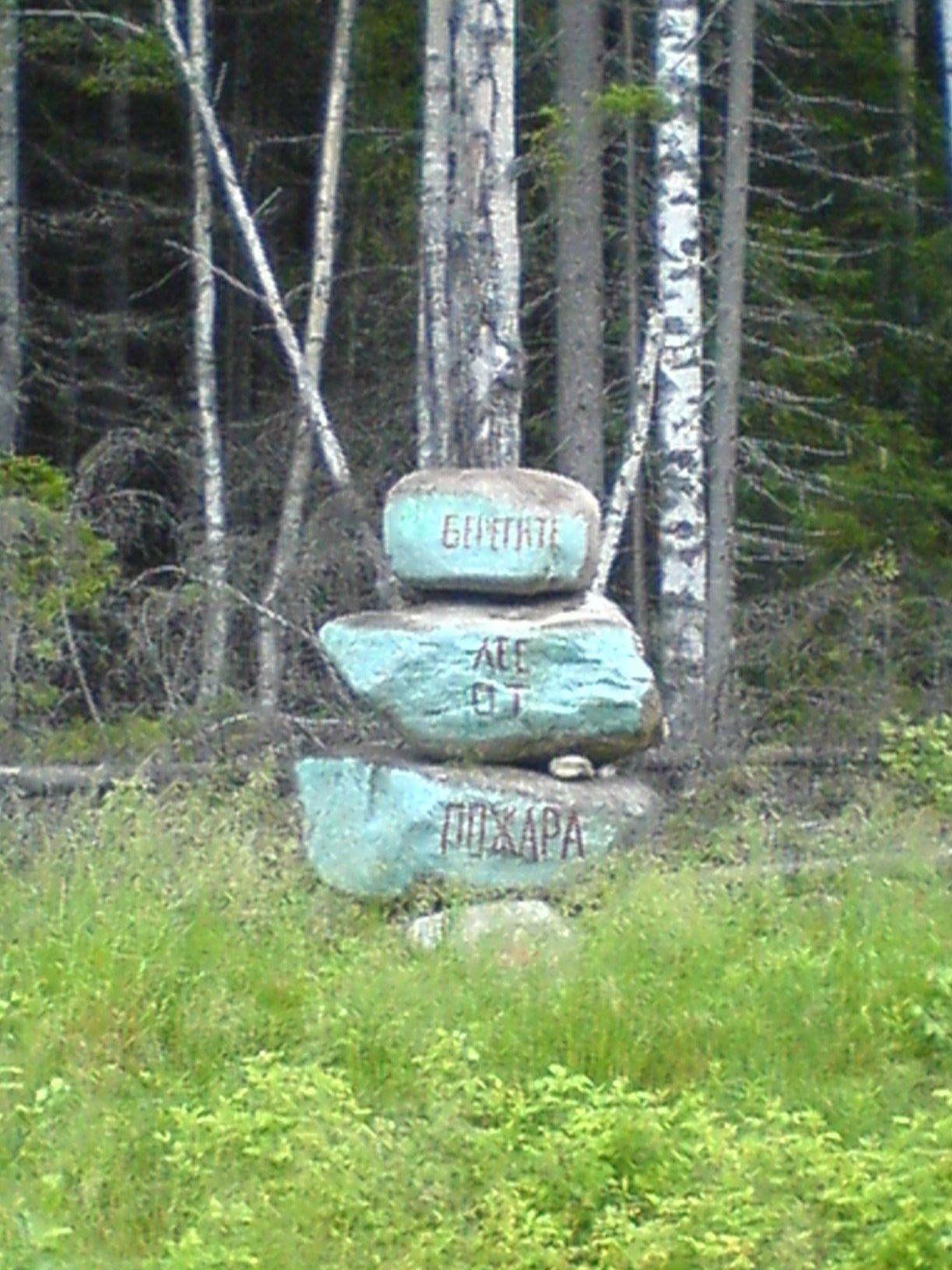 Но вот мысль удалая бодрит процесс: а что если их на попА друг дружку, да не один? Двухтонник вниз, полторашку на него, тонник венцом творенья! И всё это - одним ковшом экскаватора без посторонней помощи! Внешне выглядит просто, а на деле попробуй сотвори. Авторство сооружения принадлежит безвестным машинистам (машинисту?) питерской подрядной дорожной организации, что строила участки на трассах Петрозаводск - Олонец в конце 90-х гг. и Пудож - Медвежьегорск в 2001-2003 гг. Это уже после водружения гуликов друг на друга к творению присоседились лесники, начертав: "Берегите лес от пожара".