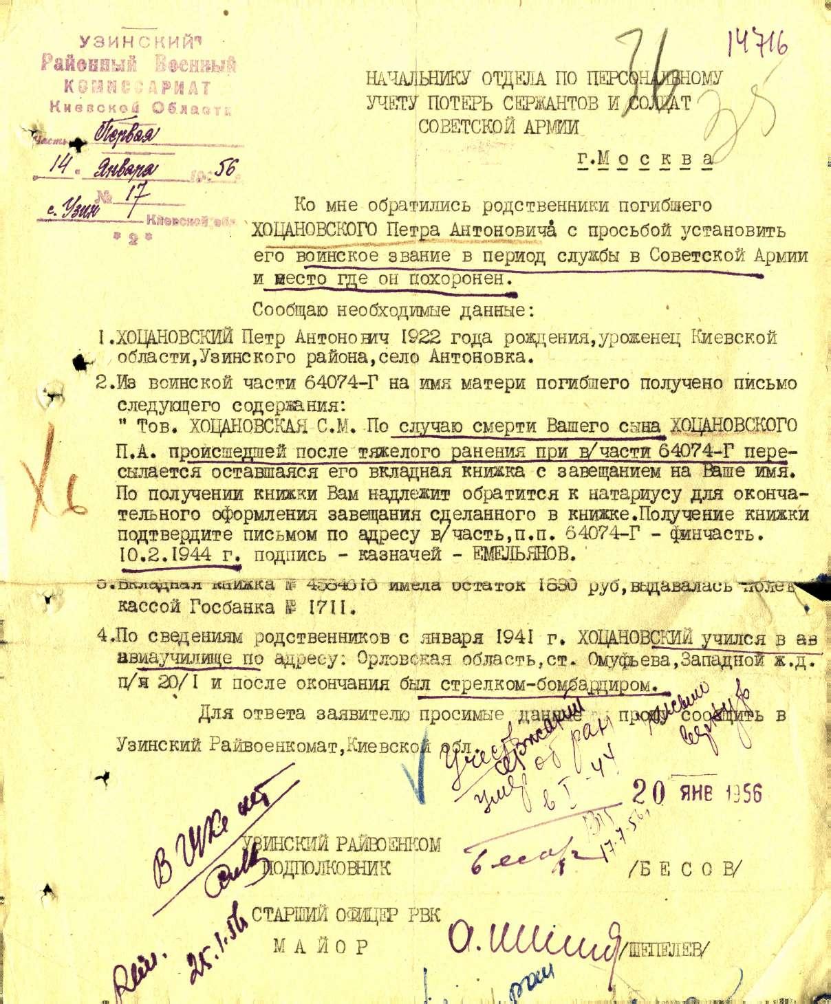 В ОБД в входящем донесении № 878 от 18.07.1956 есть 15 документов на Хоцановского Петра Антоновича, 1922 г.р., уроженца Киевской области, которого разыскивала мать после войны. Она приложила к заявлению присланную ей казначеем в/ч-пп 64074-Г вкладную книжку сына на сумму 1830 рублей с завещанием по причине гибели сына. Вкладная книжка выдана полевой кассой Госбанка № 1711: