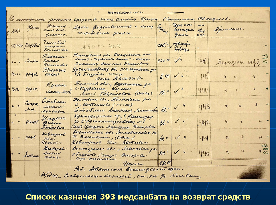 Четвёртым блоком сведений являются финансовые документы медсанбатов и госпиталей. Не те раздаточные ведомости, что хранятся в фондах многих частей, в т.ч. лечебных, а донесения начфинов по инстанции об умерших после поступления в них воинах. Вот в чём казус: госпиталь или медсанбат мог не сохранить документы по персональному учёту потерь, но начфин был обязан отчитаться за выделенные деньги. При поступлении на лечение солдата, а тем более - офицера, ему по аттестату или офицерской расчётной книжке было положено получать денежное содержание. Начфин госпиталя запрашивал вышестоящее армейское полевое отделение Госбанка, казначей медсанбата - дивизионную полевую кассу Госбанка на предмет перевода средств для выплаты по аттестатам. Средства поступали. Но получатель средств от ранений умирал. Средства, коль не успели выплатить, нужно было возвращать обратно.