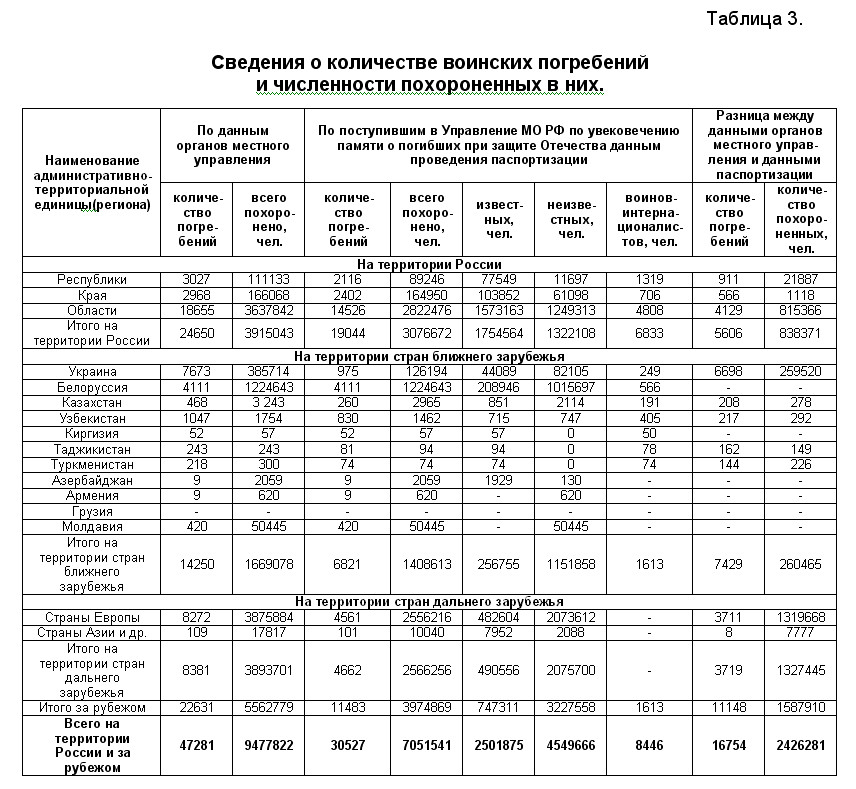 И если воинский учёт был нормален, тогда почему же в сохранённых воинских погребениях в России, странах Евросоюза, Азии согласно сведений их паспортов учтено в ОБД пока всего 2411904 человек? В них поимённо названо не более 25-30 % от реального количества погибших бойцов в каждом регионе и, возможно, государстве. И даже сведения местных органов управления о погребённых на их территориях резко разнятся с данными учёта военного ведомства: всего по странам бывшего СССР, Европы, Азии и других местные органы управления к концу 2009 г. учли 47281 воинских кладбищ и могил, военное ведомство - 30527, в т.ч. на территории бывшего СССР - 38900 и 25865 соответственно ("Бюллетень Счетной палаты РФ", № 4 (148), 2010 г., см. ниже таблицу 3).