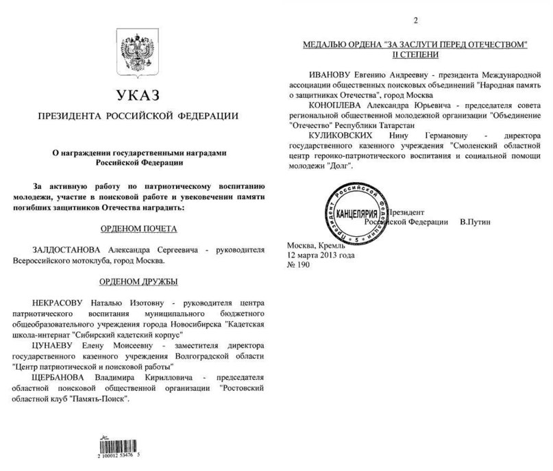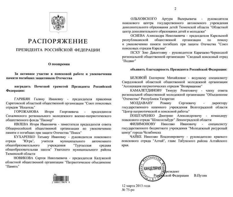 Немногим ранее 14 марта 2013 г. в резиденции Ново-Огарево Президент России В.В. Путин вручил поисковикам государственные награды и благодарности. Один "специалист по гражданскому обществу" чуть позже известил часть награжденных о том, что наградил их он, а не Президент: