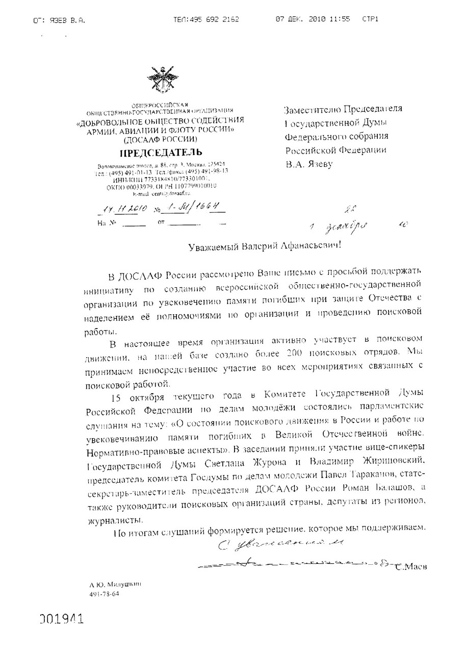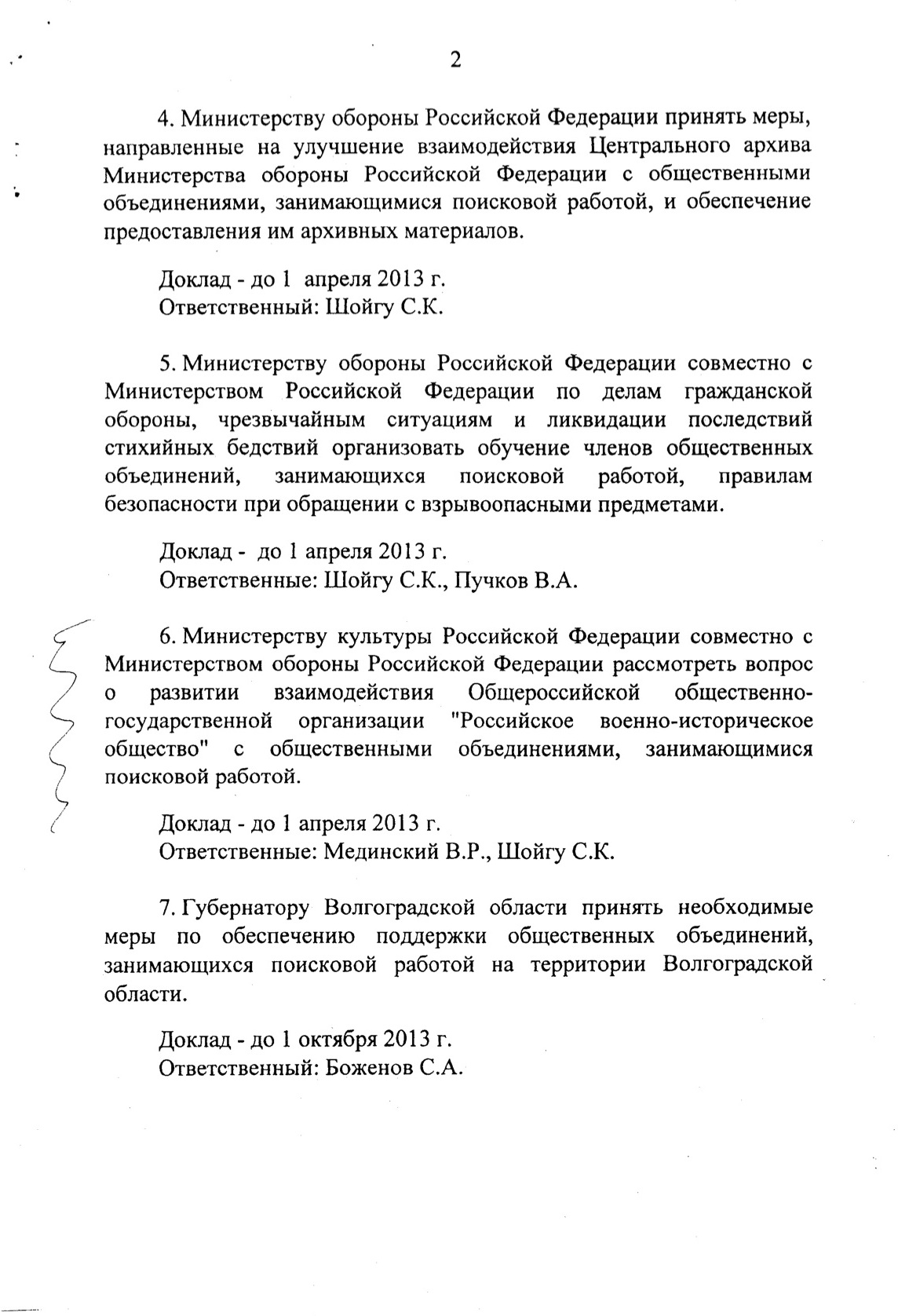 С осени 2012 г. в регионах с подачи чиновников администрации Президента РФ начались действия по созданию новой общественно-государственной организации "Российское военно-историческое общество" (далее РВИО). Зная об этом, руководством Общероссийской общественной организации "ПОИСК" в администрацию Президента РФ было направлено предложение о создании в структуре РВИО Департамента или Управления по увековечению памяти о погибших при защите Отечества как подразделения, могущего объединить и координировать действия всех поисковиков России. И это предложение было категорически отвергнуто в числе прочих.
