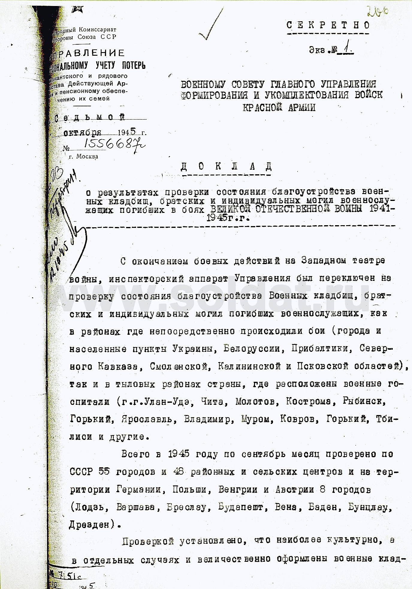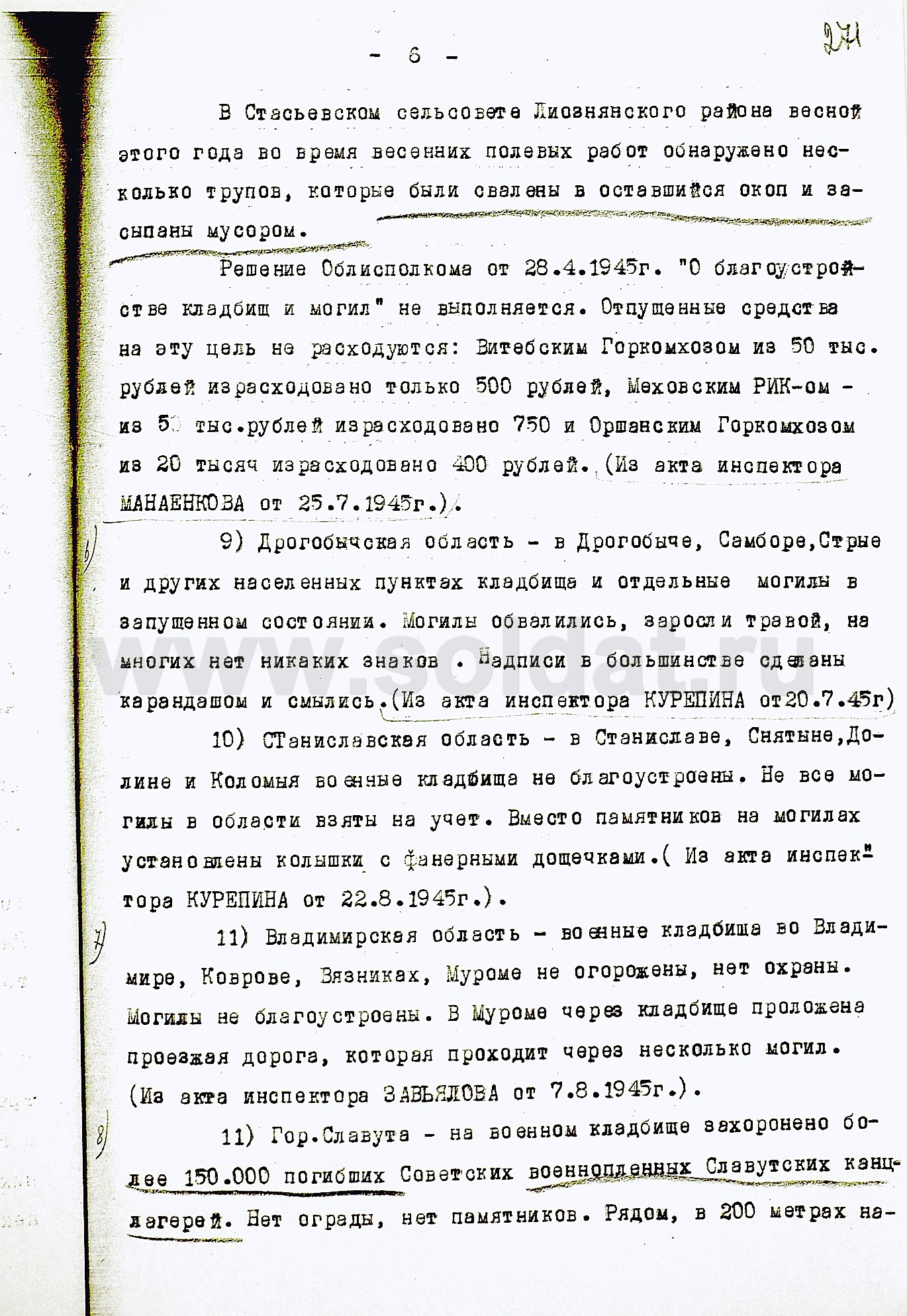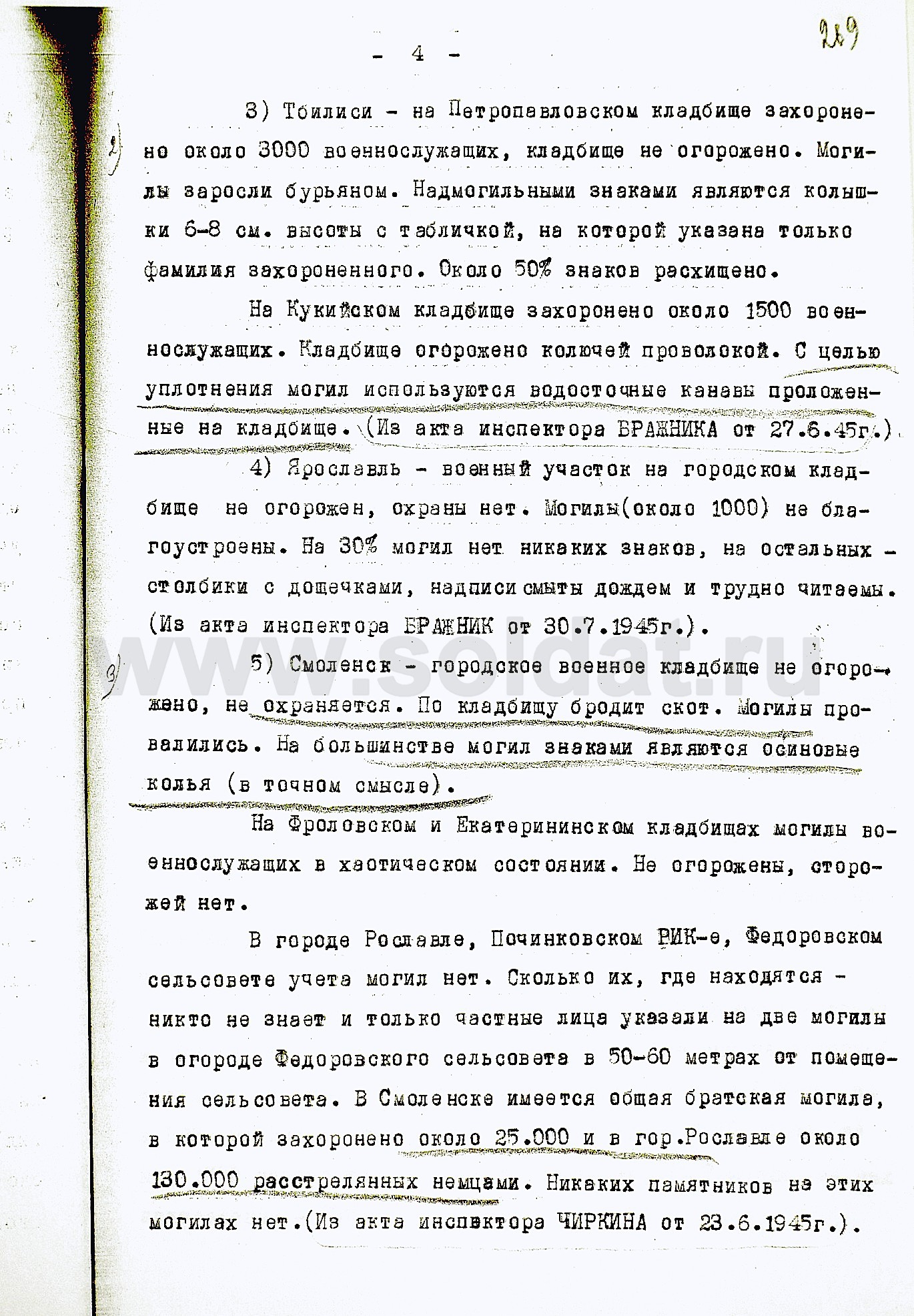 Сразу по окончании войны офицерами Управления по персональному учету потерь сержантского и рядового состава Действующей Армии и пенсионному обеспечению их семей Главупраформа РККА было проведено масштабное инспектирование воинских кладбищ и могил. Ужасающее впечатление от увиденного изложено в публикуемом ниже документе (в научный оборот вводится впервые, ссылку на источник прибережем для печатной публикации). Он стоит того, чтобы привести его полностью: