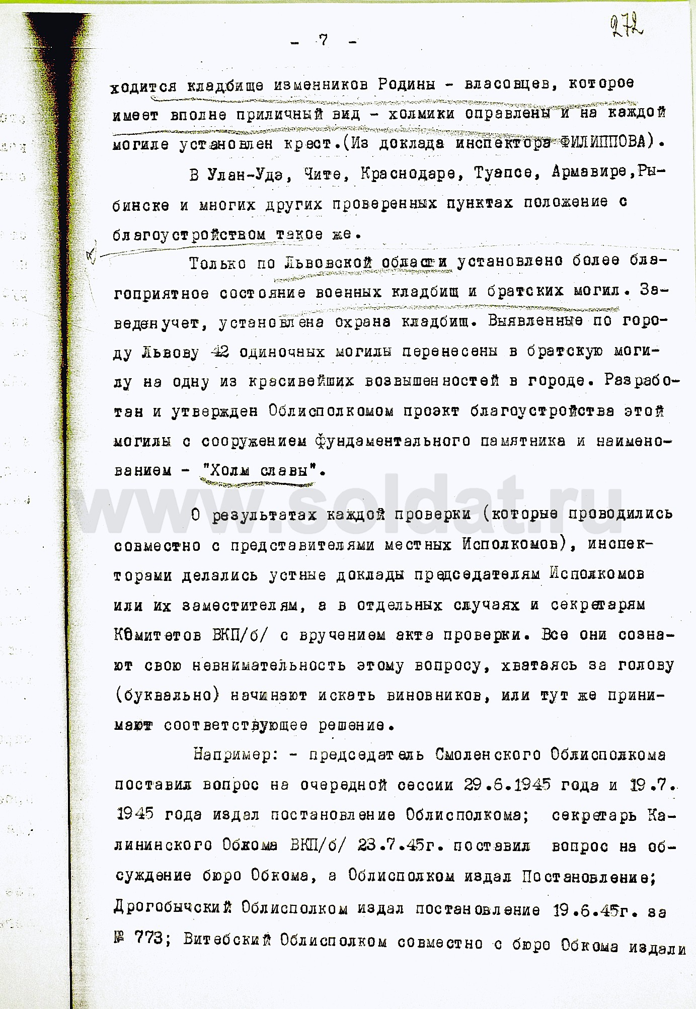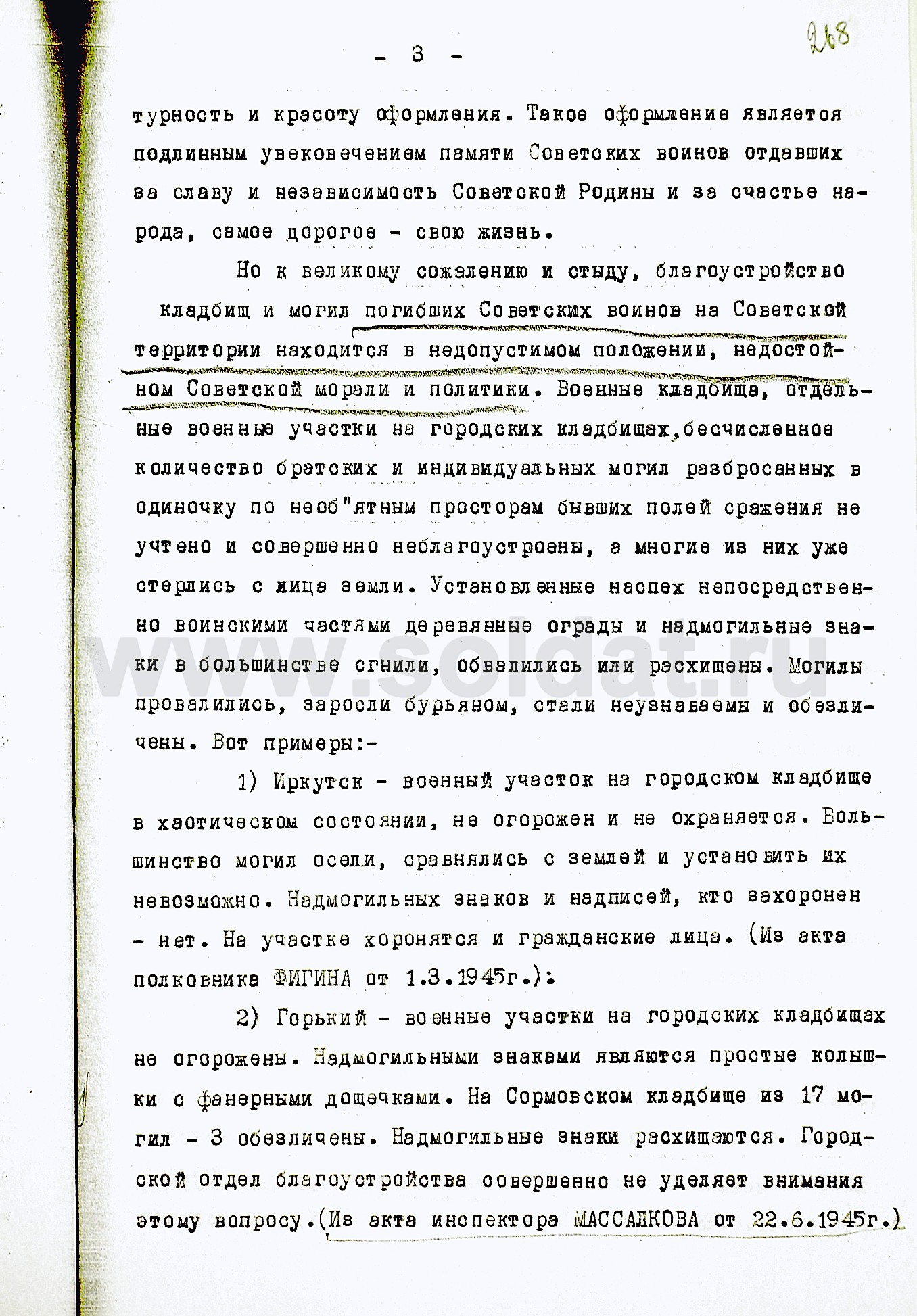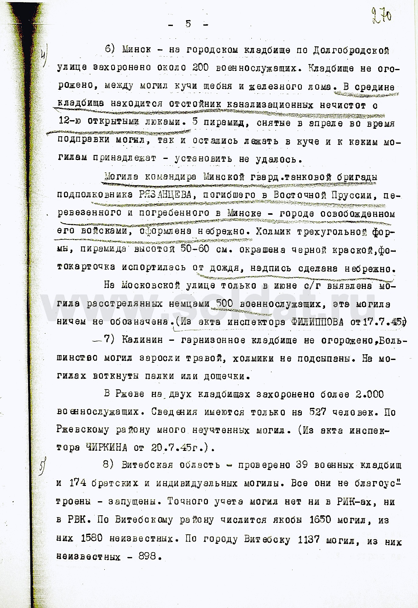 Сразу по окончании войны офицерами Управления по персональному учету потерь сержантского и рядового состава Действующей Армии и пенсионному обеспечению их семей Главупраформа РККА было проведено масштабное инспектирование воинских кладбищ и могил. Ужасающее впечатление от увиденного изложено в публикуемом ниже документе (в научный оборот вводится впервые, ссылку на источник прибережем для печатной публикации). Он стоит того, чтобы привести его полностью:
