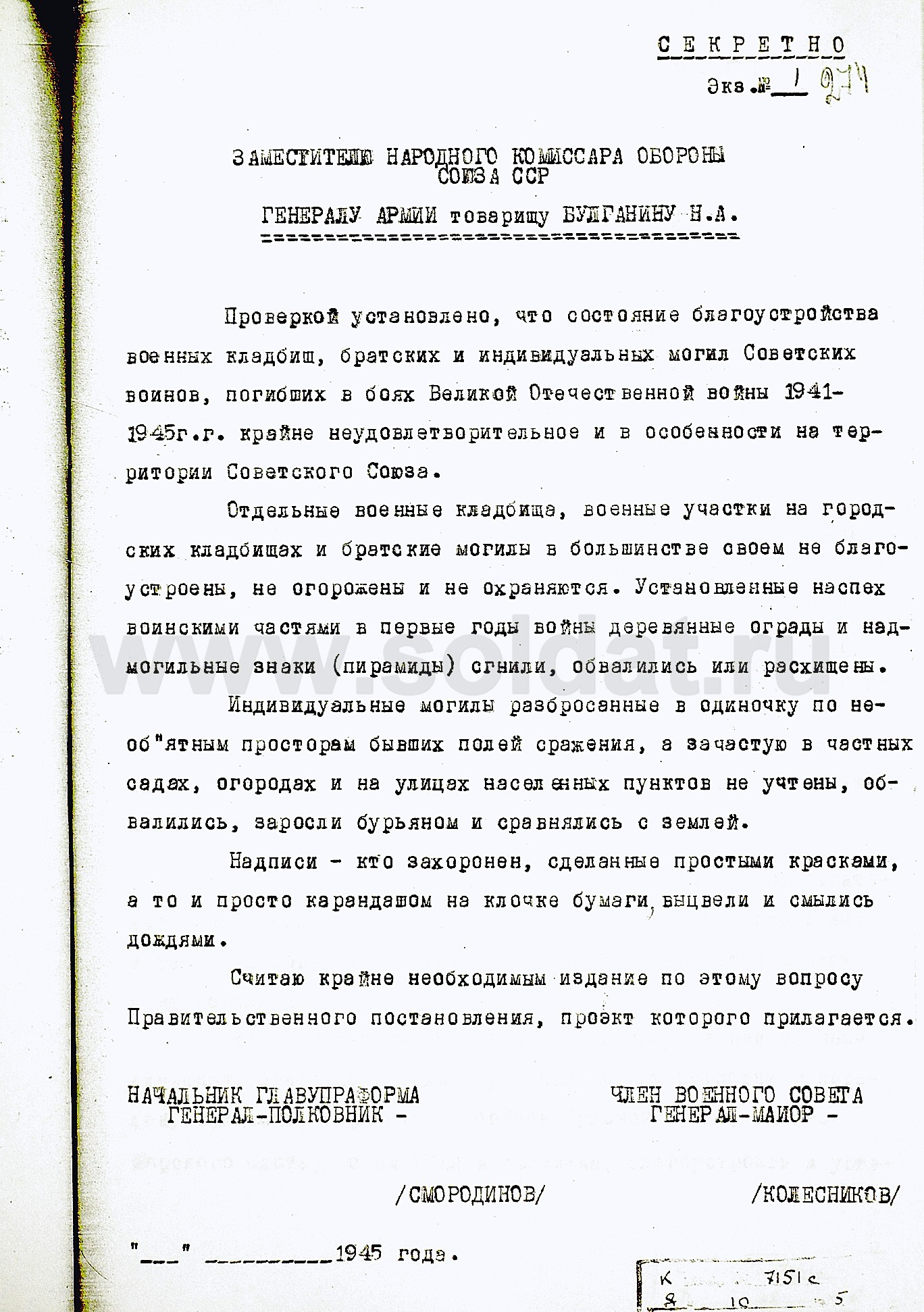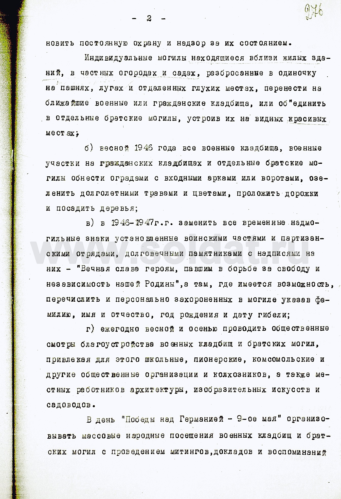 8 сентября 1950 г. вышло новое Постановление Совета Министров РСФСР № 1110, в котором отмечалось: "…Могильные холмики большинства братских могил не сохранились, обелиски на могилах отсутствуют, ограждения могил не сделаны. Исполкомы райсоветов … не принимают должных мер к охране и благоустройству памятников героям, погибшим за честь и независимость Родины". Другими словами, для того, чтобы поставить на учет конкретное воинское погребение, его прежде всего еще нужно было найти. Это было предписано сделать исполкомам районных и сельских советов. От местных жителей собирались тысячи письменных подтверждений о наличии могил, но в них, как правило, вновь не фигурировали ни имена, ни точные данные о количестве погребенных. Исполкомами областных Советов депутатов издавалось множество постановлений и распоряжений с конкретизацией процесса так называемого благоустройства братских могил и памятников. Мы его знаем по формулировкам "перенос" или "укрупнение" захоронений. На самом деле весь комплекс работ изначально назывался "благоустройством" воинских погребений. Так он, кстати, называется и поныне.