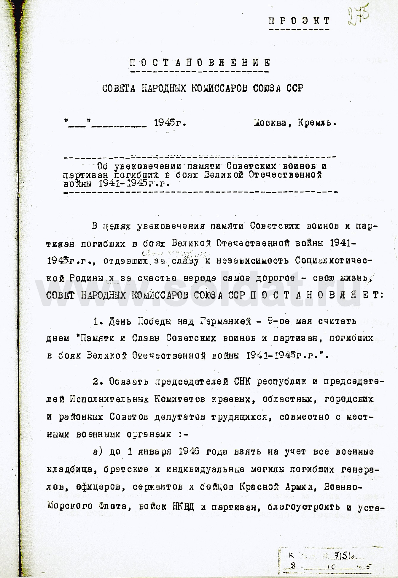 Вслед за союзным документом вышло Постановление Совета Министров РСФСР № 373 от 28 мая 1949 г. "Об утверждении инструкции о порядке учета, регистрации и содержания археологических и исторических памятников на территории РСФСР". В соответствии с ним начались работы по паспортизации воинских погребений. К историческим памятникам были отнесены "…обелиски, надгробья, братские могилы и прочие, воздвигнутые в местах общественного пользования". Их охрана возлагалась на органы благоустройства местных Советов депутатов трудящихся. Все братские могилы надлежало паспортизировать по форме, установленной Комитетом по делам культурно-просветительных учреждений при Совете Министров РСФСР: