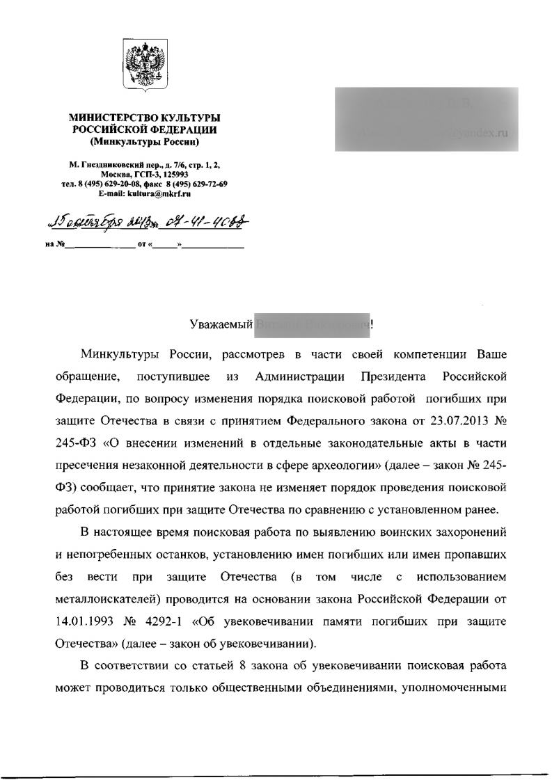 И венцом всей чехарды с поисковым движением стал официальный документ от 15 октября 2013 г., "вымученный" нормативно-правовым управлением Министерства культуры РФ и впервые разъяснивший всему честнОму народу от Поиска текущую ситуацию (кстати, довольно корявым и местами безграмотным языком, не подобающим ответу министерства):