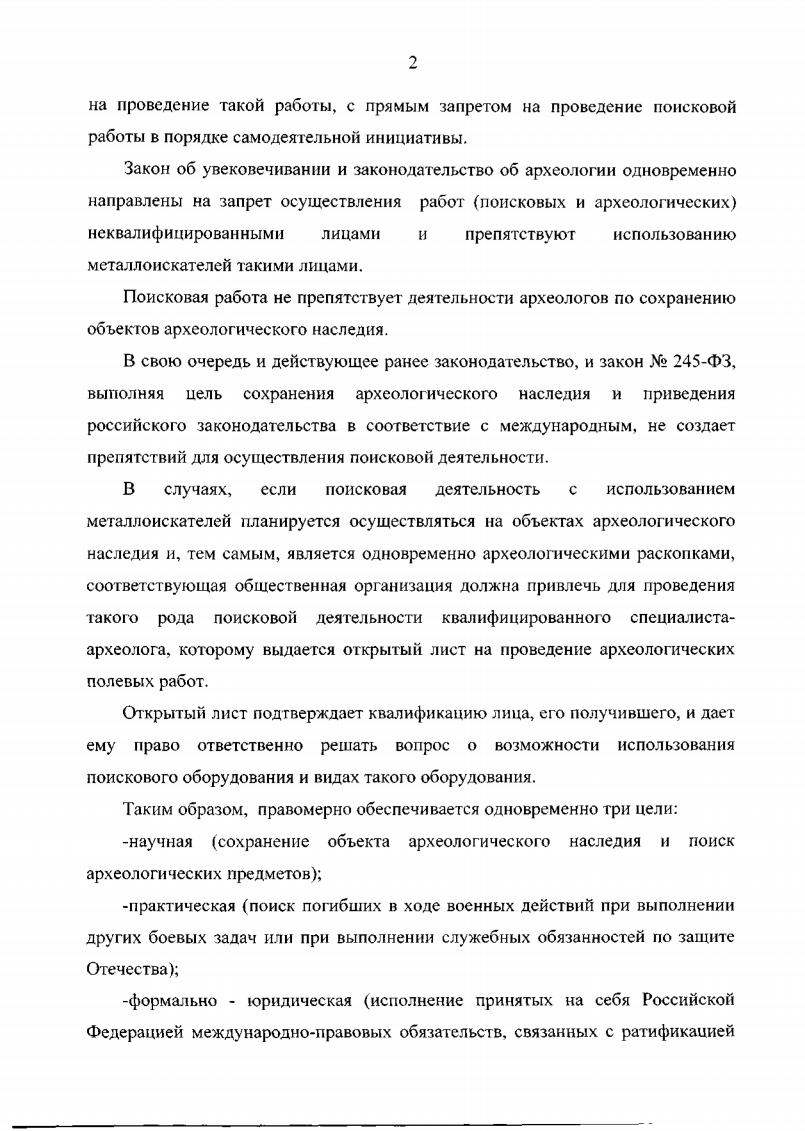 7 февраля 2013 г. в Госдуму Федерального Собрания РФ Правительством РФ по инициативе Министерства культуры был представлен законопроект "О внесении изменений в отдельные законодательные акты РФ в части пресечения незаконной деятельности в области археологии" .