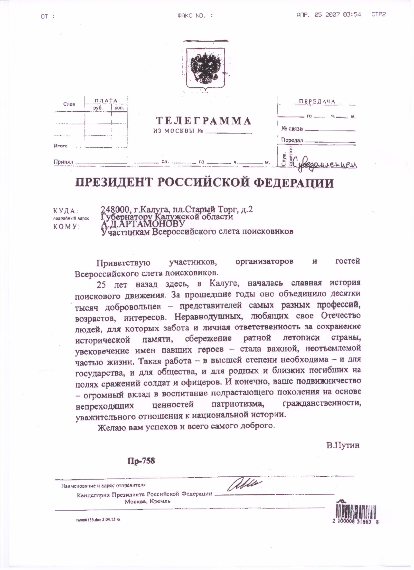 С 12 апреля 2013 г. в Калуге начался Всероссийский слет поисковиков. Президент России обратился с приветственной телеграммой в его адрес: