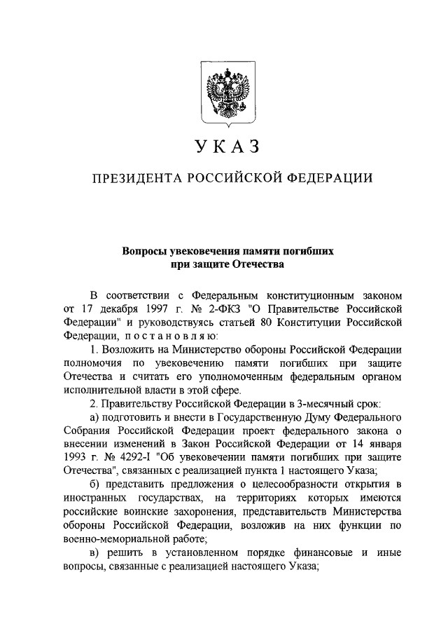 "Статья 10. Руководство работой по увековечению памяти погибших при защите Отечества и ее координация возлагаются на уполномоченный федеральный орган исполнительной власти. Деятельность указанного органа и работа по увековечению памяти погибших при защите Отечества осуществляются в порядке, определяемом Президентом Российской Федерации…
